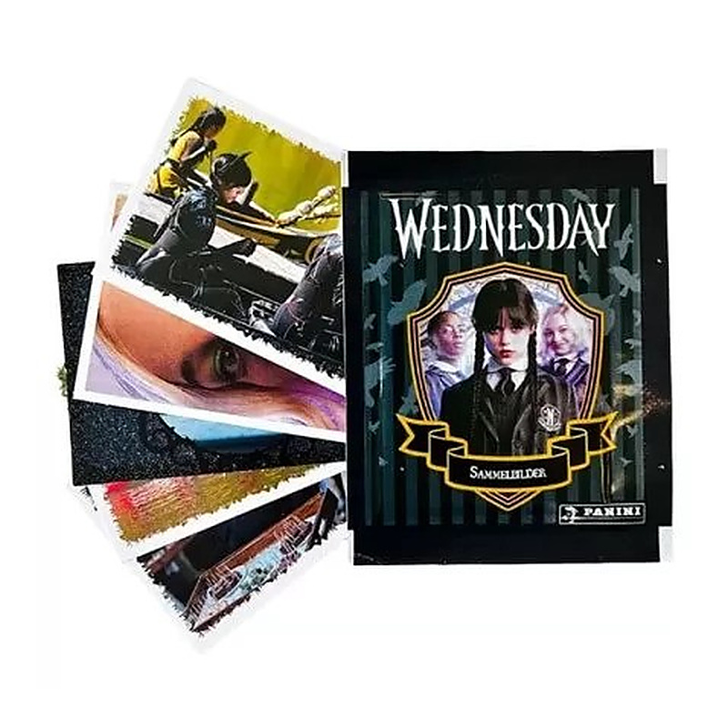Hivatalos Panini gyűjtői matricacsomag a Wednesday sorozathoz. Egy tasak 5 db véletlenszerű matricát tartalmaz, amikkel lehet gyűjteni, cserélni, és megtölteni a hozzá tartozó albumot.