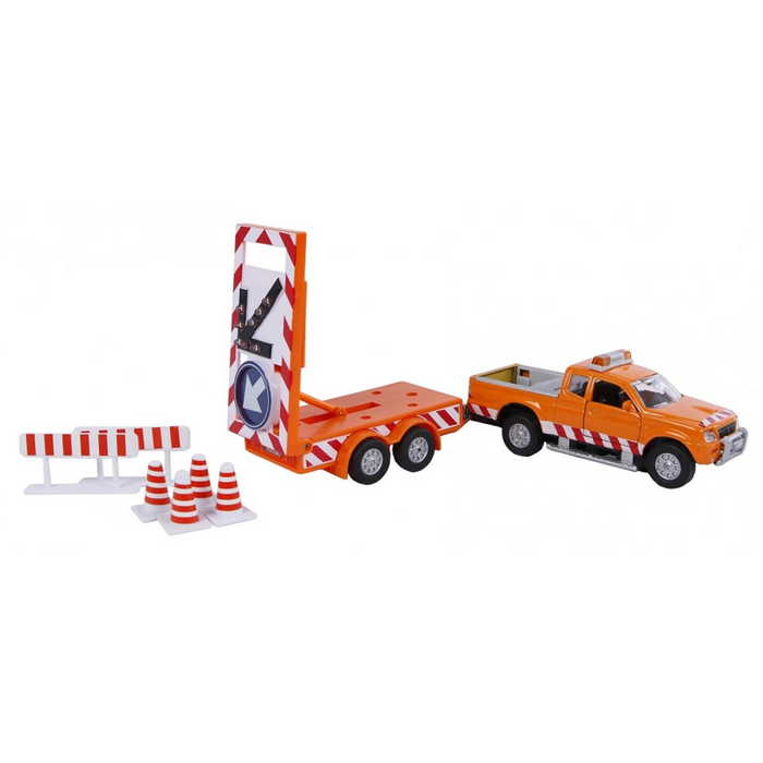 Közúti karbantartó terepjáró pótkocsival � jelzéssel. A jármű hang- és fényeffektusokkal rendelkezik, ajtajai nyithatók, a pótkocsi pedig könnyen leszerelhető.