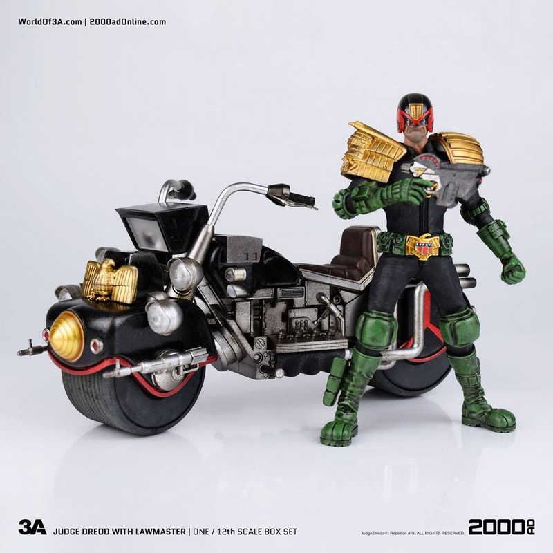 The Lawmaster is a Judges best defense on the violent streets of Mega-City One. The 3A Modified Mk1 comes armed with Mike McMahon styled Bike Cannons to take down creeps and blaze a trail across the Cursed Earth. The Lawmaster features a vintage silhouette, LED Illuminated lights, rubberized soft vinyl tires, and is able to fit 1/12th Scale Collectible Figures. A classic approach to one of the most iconic vehicles in comics history, blending in all the detail and weathering 3A are known for.