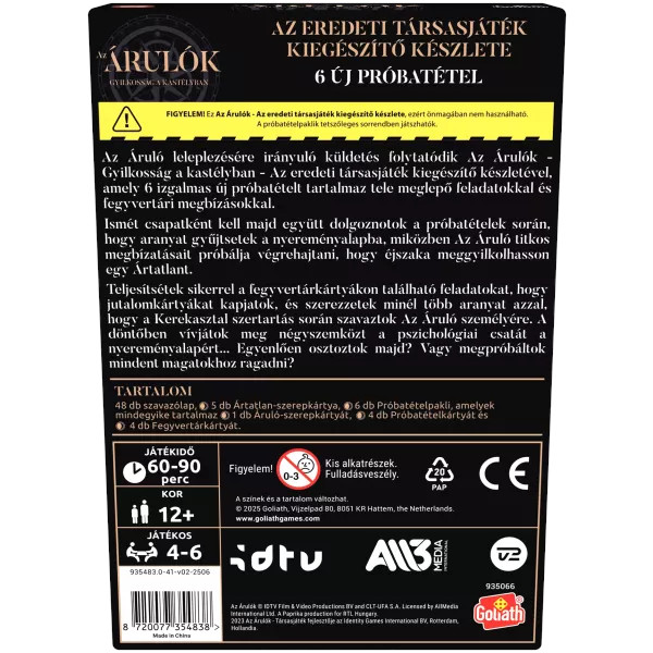 A játék kiegészítő, az eredeti Árulók társasjáték nélkül nem használható!