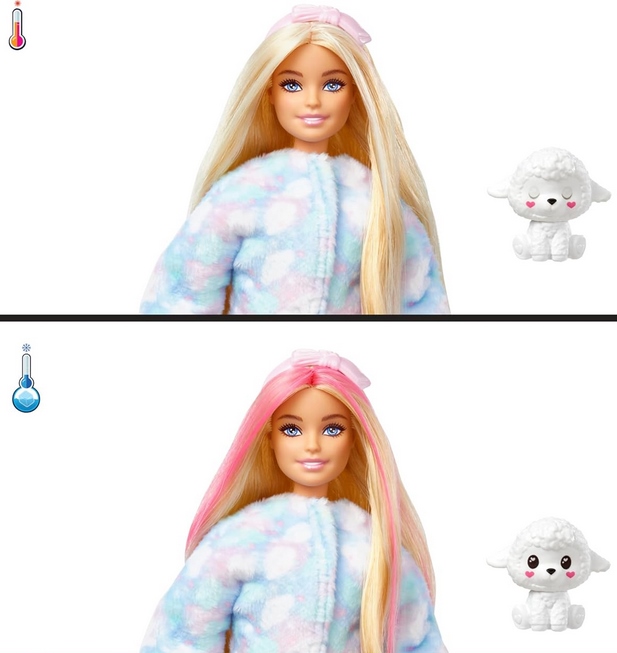 Ez a Barbie Cutie Reveal meglepetés baba szett (HKR03) izgalmas kicsomagolási élményt kínál, hiszen egy puha plüss bárány jelmez alatt rejtőzik a divatos Barbie baba, amelyhez összesen 10 meglepetés tartozik, köztük ruhák, cipők, kiegészítők és egy aranyos kisállat figura, így a játék minden alkalommal új felfedezést nyújt. A baba hosszú hajjal és mozgatható végtagokkal rendelkezik, a szett különlegessége pedig a színváltó funkció, amely hideg és meleg víz hatására változtatja a haj és a kisállat részleteinek színét, ezzel még élvezetesebbé téve a játékot. Méret: kb. 30 cm magas (klasszikus Barbie méret). Anyag: műanyag baba, textil ruházat és puha plüss jelmez kombinációja. Korosztály: 3 éves kortól ajánlott, ideális kreatív szerepjátékhoz és Barbie rajongóknak.