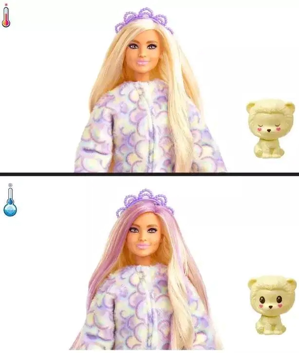 A Barbie Cutie Reveal Oroszlán a Mattel aranyos, állatjelmezes sorozatának része, 3 éves kortól ajánlott. A csomag 10 meglepetést rejt, köztük egy hajlítható Barbie babát, puha oroszlán jelmezzel és 4 meglepetés tasakkal. A jelmez levétele után előbukkan a hosszú hajú, csillogó részletekkel díszített Barbie baba, a tasakokban pedig ruhák, kiegészítők, szivacs-fésű és egy kis oroszlán található.A jelmez felső része puha kabáttá alakítható, a fejrész pedig kisállat fekhelyként használható. Hideg víz hatására a baba sminkje és haja is megváltozik, a kis oroszlán "kinyitja és becsukja" a szemét, meleg vízzel pedig minden visszaáll az eredeti állapotra.