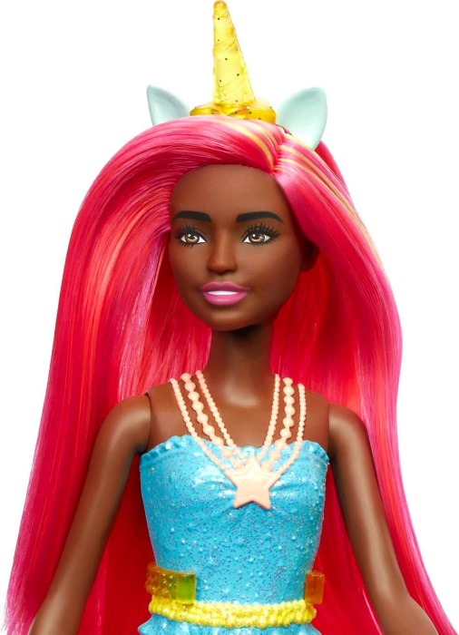 Mozgatható Barbie baba mesebeli kinézettel, színes ruhában és levehető egyszarvús fejpánttal, amelytől a baba egyszarvú-szerűvé alakítható. A csomag a babát és a fejpántot tartalmazza, de más játékok nem részei a csomagnak. A figura önmagában nem áll meg, és a játékot 3 éves kortól ajánlják.