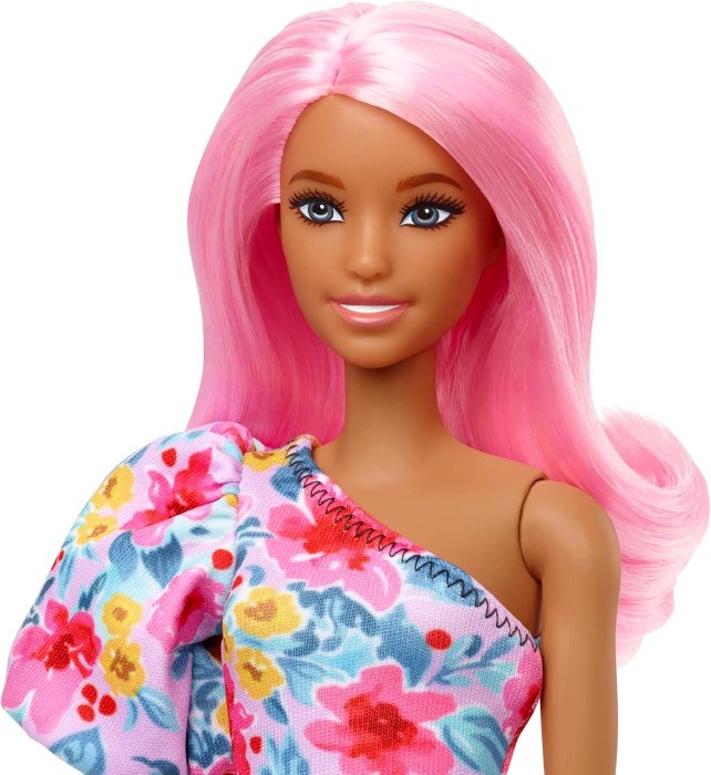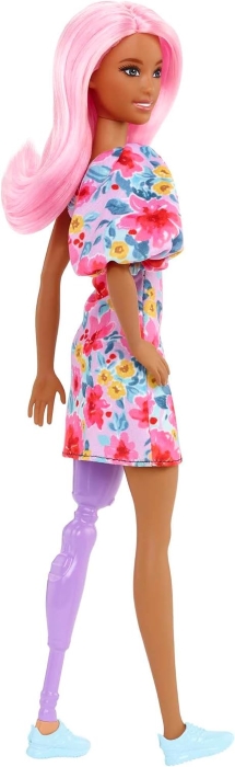 Egy Barbie Fashionistas sorozatba tartozó baba, aki élénk rózsaszín hajjal és virágmintás ruhában érkezik. A figura jobb lába protézissel készült, és fehér tornacipőt valamint napszemüveget visel. A csomag a babát és a kiegészítőket tartalmazza, de más játékokat vagy babákat nem tartalmaz. A baba mozgatható végtagokkal rendelkezik, és 3-éves kortól alkalmas játékra.