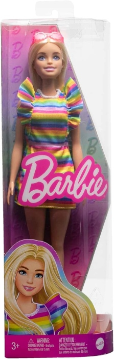 Ez egy Barbie Fashionistas kollekcióba tartozó játékbaba szivárványos ruhában, szőke hajjal és fogszabályzóval. A csomag tartalmaz platform cipőt és napszemüveget is, amely divatos megjelenést ad a játéknak. A baba mozgatható végtagokkal rendelkezik, a szerepjátékot és kreatív divat-mesélést ösztönzi, és 3 éves kortól ajánlott.