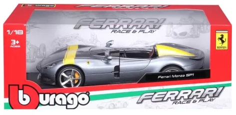 A Bburago Ferrari Monza SP1 1:18 Silver Metallic egy 1:18 méretarányú, részletgazdag kidolgozású fém modellautó, amely a különleges kialakítású Ferrari Monza SP1 sportkocsit mintázza. Az öntött fém karosszéria ezüst metál fényezést kapott, a modell precízen kialakított műanyag részletekkel, élethű belső térrel, részletes műszerfallal és kidolgozott külső elemekkel készül. A gumiabroncsokkal szerelt kerekek és a nyitható elemek tovább növelik a realizmust, így a modell esztétikus és igényes darab gyűjtők és Ferrari-rajongók számára.