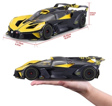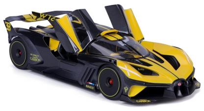 A Bburago Bugatti Bolide 1:18 Yellow egy 1:18 méretarányú, részletgazdag kidolgozású fém autómodell, amely a Bugatti Bolide sárga fényezésű változatát ábrázolja. A modell öntött fém karosszériából és precíz műanyag részletekből áll, kidolgozott külső elemekkel, aerodinamikai formákkal és belső térrel készül. Az ajtók és motorháztető általában nyithatók, a kormánykerék pedig a kerekek irányítását teszi lehetővé, így élethű megjelenést biztosít gyűjtők és szuperautó-rajongók számára.