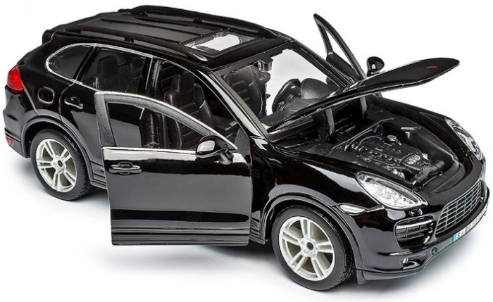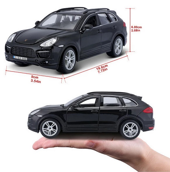 A Bburago 1:24 Porsche Cayenne TURBO Black egy 1:24 méretarányú, részletgazdag fém autómodell, amely a Porsche Cayenne Turbo sport-terepjármű fekete változatát ábrázolja. A modell két nyitható ajtóval és motorháztetővel rendelkezik, a kormánykerékkel a kerekek iránya is mozgatható, a karosszéria pedig öntött fém és kidolgozott műanyag elemek kombinációjából áll. A részletes belső tér, lámpák és egyéb külső részletek élethű megjelenést biztosítanak, így ez az autómodell gyűjtők és autórajongók számára egyaránt látványos darab