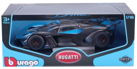 Bburago Bugatti Bolide 1:18 Autómodell részletgazdag 1:18 méretarányú fém die-cast modellautó a legendás Bugatti Bolide hiper-sportkocsiból kék-fekete kivitelben. Az autó nyitható ajtókkal, motorháztetővel és csomagtartóval rendelkezik, ami még valósághűbb játék- vagy gyűjtési élményt biztosít. A fém karosszéria és precíz kidolgozás kiemeli a sportautó jellegét, így ideális választás autómodell-rajongóknak, gyűjtőknek vagy nagyobb gyerekeknek.