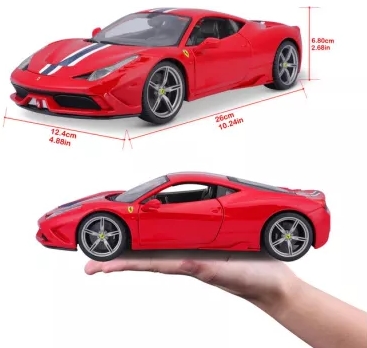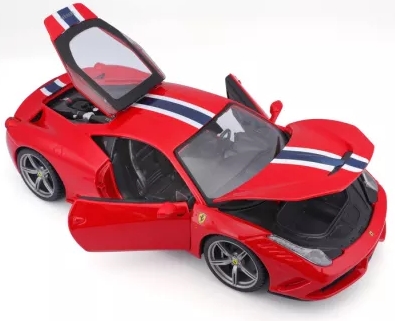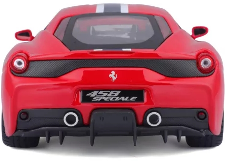 A Bburago Ferrari 458 Speciale 1:18 Red egy 1:18 méretarányú, részletgazdag kidolgozású fém autómodell, amely a Ferrari 458 Speciale piros fényezésű változatát ábrázolja. A modell öntött fém karosszériából és precíz műanyag részletekből áll, kidolgozott külső elemekkel, lámpákkal és belső térrel készül. Az ajtók és a motorháztető általában nyithatók, a kormánykerék pedig a kerekek irányítását teszi lehetővé, így élethű megjelenést biztosít gyűjtők és autórajongók számára.