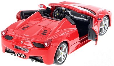 A Bburago Ferrari 458 Spider 1:24 Red egy 1:24 méretarányú, részletgazdag öntött fém modellautó, amely a Ferrari 458 Spider piros változatát ábrázolja. A karosszéria fém és műanyag elemek kombinációjából készül, kidolgozott külső és belső részletekkel, valósághű gumiabroncsokkal és nyitható ajtókkal. Ez a modell autórajongók és gyűjtők számára látványos és kívánatos darab, amely jól mutat vitrinben vagy polcon is.