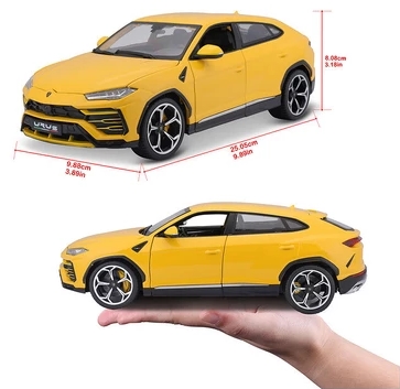 A Bburago Lamborghini Urus 1:18 Yellow egy 1:18 méretarányú, részletgazdag kidolgozású fém autómodell, amely a Lamborghini Urus sárga fényezésű változatát ábrázolja. A modell öntött fémből és precíz műanyag alkatrészekből készül, kidolgozott külső elemekkel, lámpákkal és belső térrel. Az ajtók és a motorháztető nyithatók, a kerekek irányítása a kormánykerékkel működik, így élethű megjelenést biztosít gyűjtők és autórajongók számára.