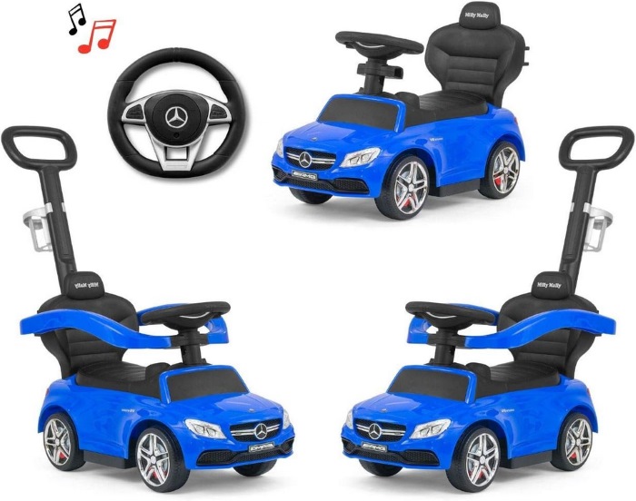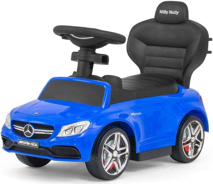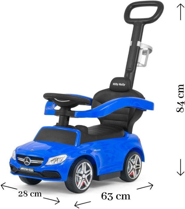 A Mercedes-Benz AMG C63 Coupe Milly Mally bébitaxi fekete kivitelben egy stílusos és játékos lábbal hajtós jármű kisgyermekek számára, amely a valódi Mercedes formajegyeit idézi. Kiváló minőségű, tartós műanyagból készült, stabil konstrukcióval, kényelmes széles üléssel és tárolóhellyel az ülés alatt. A játék kormánykereke dudával és dallamgombokkal van ellátva, így még szórakoztatóbb a használata. Az autó ideális 12-36 hónapos gyermekeknek, legfeljebb kb. 25 kg terhelhetőségig, és játékosan segíti a mozgáskoordináció és egyensúly fejlődését. A Mercedes-stílusú dizájn és a fekete szín még vonzóbbá teszi ezt a bébitaxit, amely remek ajándék minden kis autórajongónak. Méretei kb. 64 cm hossz, 28 cm széles és 38 cm magas, így tökéletes beltéri és kültéri játékhoz is.