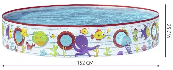 Ez a tengeri mintás, merevfalú gyermekmedence tökéletes választás a nyári pancsoláshoz, hiszen stabil kialakításának köszönhetően nem igényel felfújást, egyszerűen felállítható és azonnal használatra kész, a masszív oldalfalak pedig megtartják a formát még teljes feltöltés mellett is, így biztonságos és kényelmes játékteret biztosít több gyermek számára is. Méret: kb. 152 x 25 cm, ideális méret kerti használatra és kisebb gyerekek számára. Anyag: strapabíró PVC/vinyl, amely ellenáll a kültéri igénybevételnek és hosszú élettartamot biztosít. Korosztály: 2 éves kortól ajánlott, így kiváló választás kisgyermekek számára a hűsítő, aktív nyári játékhoz.
