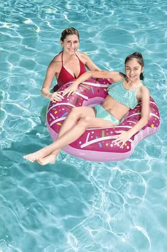 Ez a Bestway fánk mintás úszógumi (36118) egy nagyméretű, stabil felfújható vízi eszköz, amely kényelmes lebegést biztosít medencében vagy strandon, miközben a látványos harapott fánk dizájn játékos megjelenést ad. A körkörös kialakítás egyenletes tartást biztosít a vízen, így pihenéshez és könnyed vízi használathoz is ideális. Méret: kb. 107 x 107 x 42 cm (leeresztve 107 cm átmérő), amely egy fő számára kényelmes használatot biztosít. Anyag: tartós, erős PVC alapú felfújható műanyag, amely ellenáll a vízi igénybevételnek és hosszabb használatra készült. Korosztály: 12 éves kortól ajánlott, gyermekek és felnőttek számára egyaránt megfelelő. Gyorsan felfújható és leereszthető, könnyen szállítható, így praktikus választás nyári vízi kikapcsolódáshoz.