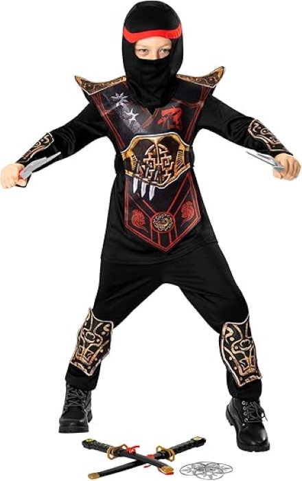 Gyerek piros ninja jelmez, könnyű poliészter anyagból, klasszikus harcos stílusban. A szett felsőrészből, nadrágból és kapucniból/maszkból áll, így gyorsan átváltozhat a gyermek egy nindzsává farsangra, halloweenre vagy jelmezbulira. A ruhadarabok kényelmesek és egyszerűen viselhetők, ideális szerepjátékhoz és tematikus eseményekhez.