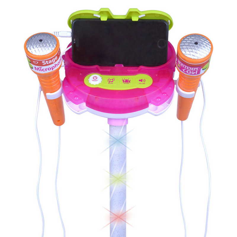 Énekelj a Bontempi színpadi mikrofonjával. Mivel a készlet 2 mikrofonnal rendelkezik, együtt is énekelhettek! Nyomd meg a gombokat a kísérő dallamhoz, a dobritmusokhoz vagy a dörgő tapshoz. A beépített fényeffektusok teszik teljessé a műsort. A szett strapabíró műanyagból készült és állítható magasságú. Lehetőség van okostelefon csatlakoztatására, a csatlakozás mini jack csatlakozó. 3 darab AA elemmel működik (nem tartozék).
