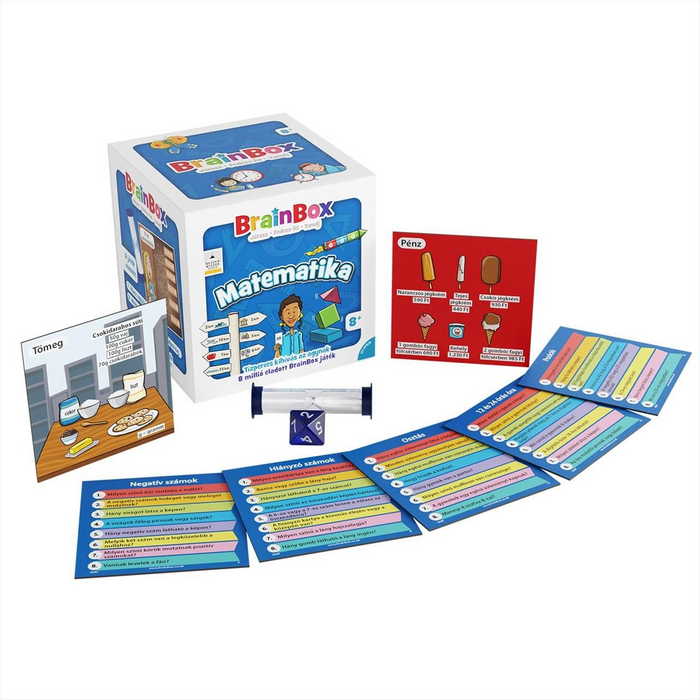 A BrainBox Matematika izgalmas kihívás az agynak! Gyorsan tanulsz? Lássuk, hogy boldogulsz az matekkal! A BrainBox Matematika remek agytorna és szórakozás, egy vagy akár több játékos részére! Húzz egy kártyát, tanulmányozd, és jegyezz meg minél több információt 10 másodperc alatt. Ezután fordítsd le a kártyát, dobj a kockával, és válaszolj helyesen a kidobott számmal jelölt kérdésre. Ne húzd ám az időt, hiszen a homokórán gyorsan leperegnek a szemek! A válaszokat a kártyán ellenőrizheted. Ha jó megfigyelő vagy, és jól pörög az agyad a matekban, akkor a legtöbb kártya nálad landol! A BrainBox a gyors megfigyelések és a vizuálismemória-kérdések családi játéka.