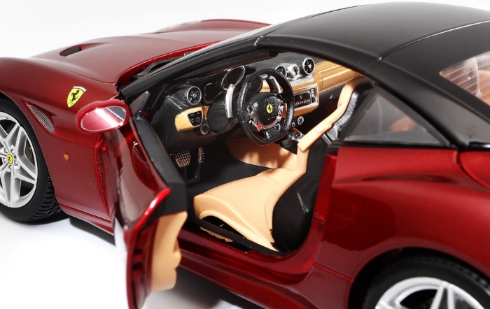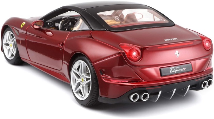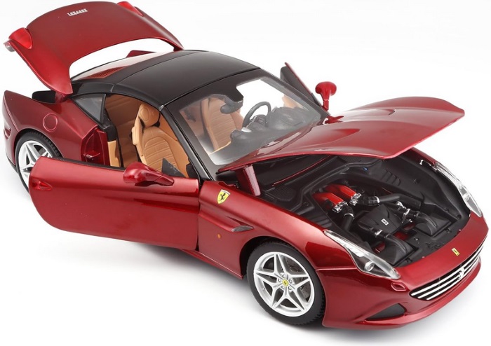 A Bburago Ferrari California 1:18 egy 1:18 méretarányú, részletgazdagon kidolgozott fém autómodell, amely a Ferrari California sportos luxusautó változatát ábrázolja több színben. A modell öntött fém karosszériából és precíz műanyag részletekből készült, valósághű külső elemekkel, kidolgozott lámpákkal és beltérrel. Az ajtók és a motorháztető nyithatók, a kormány pedig a kerekek irányítását teszi lehetővé, így gyűjtők és autórajongók számára élethű megjelenést biztosít.