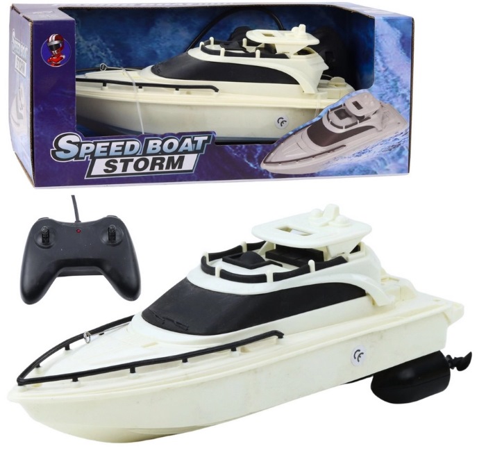 Az RC Speed Boat Storm távirányítású motorcsónak egy sportos, vízen használható játék, amely gyors és élvezetes irányítást kínál. A fekete-fehér kialakítású hajó kompakt méretű, kb. 25,8 cm hosszú, így jól kezelhető medencében, tóban vagy egyéb vízfelületen. A 2,4 GHz-es távirányítónak köszönhetően pontosan és stabilan irányítható, több jármű mellett is zavartalan működést biztosít. A hajó és a távirányító külön elemekkel működik: a motorcsónak 3 db AA elemet, a távirányító 2 db AA elemet igényel, amelyek nem tartozékok. Strapabíró műanyagból készült, így ellenáll a vízi használatból adódó igénybevételnek.