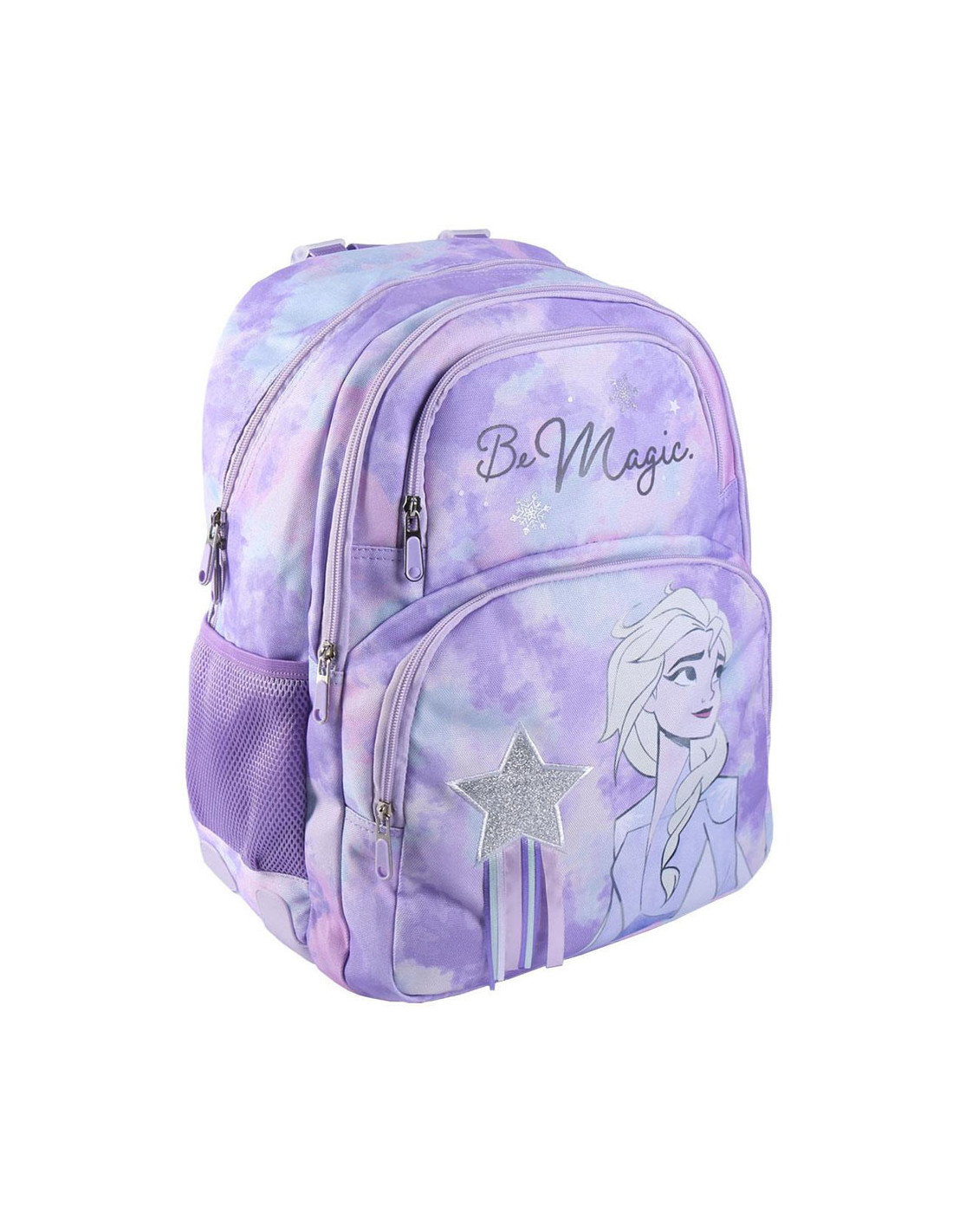Igazán varázslatos látványt nyújt ez a táska a csillagokkal és a halványlila színével, sőt, még kedvenced, Elsa is helyet kapott rajta! Jégvarázs Be Magic iskolatáska állítható vállpántokkal, kényelmes hátrésszel, belül egy nagy cipzáras rekesszel, elöl egy nagyobb és egy kisebb írószertartós, cipzáras rekesszel, két oldalán hálós zsebbel, 32 x 44 x 18,5 cm-es méretben a Cerda-tól!