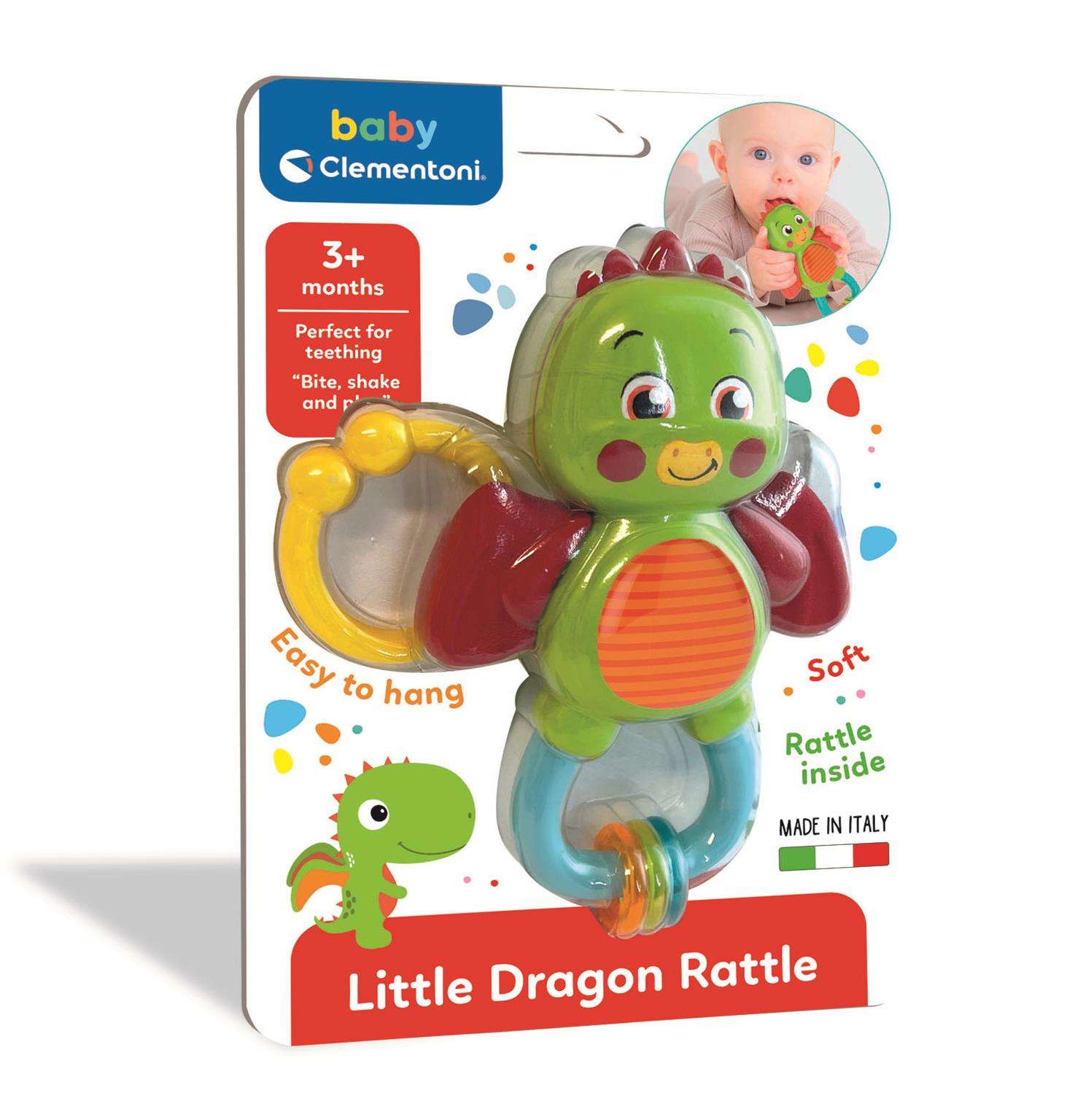 Ha a legcukibb barátot keresed a kisbabád számára, akkor ez a kis zöld sárkány rágóka kiváló választás, aki a mindennapok mellett a fogzás nehéz időszakában is kiváló társ lesz! Sárkány rágóka, csörgő hanggal és akasztóval, kb. 17 x 25 centiméteres méretben a Clementoni Baby-től!