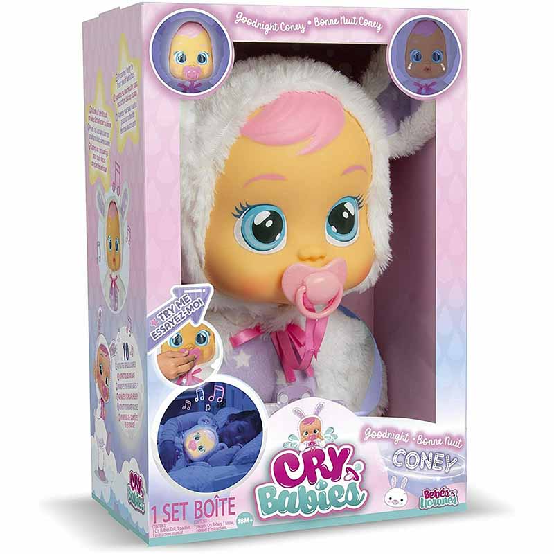A Cry Babies Coney - Jó éjszakát! egy interaktív síró játékbaba a Cry Babies sorozatból. A baba valódi könnyeket sír és babahangokat ad ki, amikor kivesszük a cumiját, majd megnyugszik, ha visszahelyezzük azt. Coney fésülhető hajjal és levehető ruhával rendelkezik, így kreatív szerepjátékra ad lehetőséget már 18 hónapos kortól.