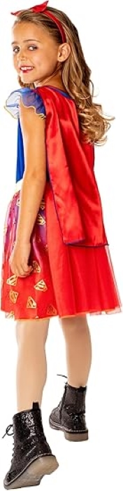 Teljes Supergirl gyerekjelmez, amely klasszikus szuperhős-stílusú megjelenést ad farsangi bulikra, tematikus eseményekre vagy szerepjátékhoz. A szett egy mintás ruhát piros köpeny-elemmel, övvel és fejpánttal ad, így a gyermek az elejétől a végéig hiteles jelmezben lehet. Az elemek könnyűek és egyszerűen fel- és levehetők, valamint kényelmes viseletet biztosítanak mozgás közben is. A részletgazdag kidolgozás és élénk színek vidám, ünnepi megjelenést kölcsönöznek a kicsinek�így ő lehet a jelmezbál, farsang vagy tematikus parti fénypontja.�