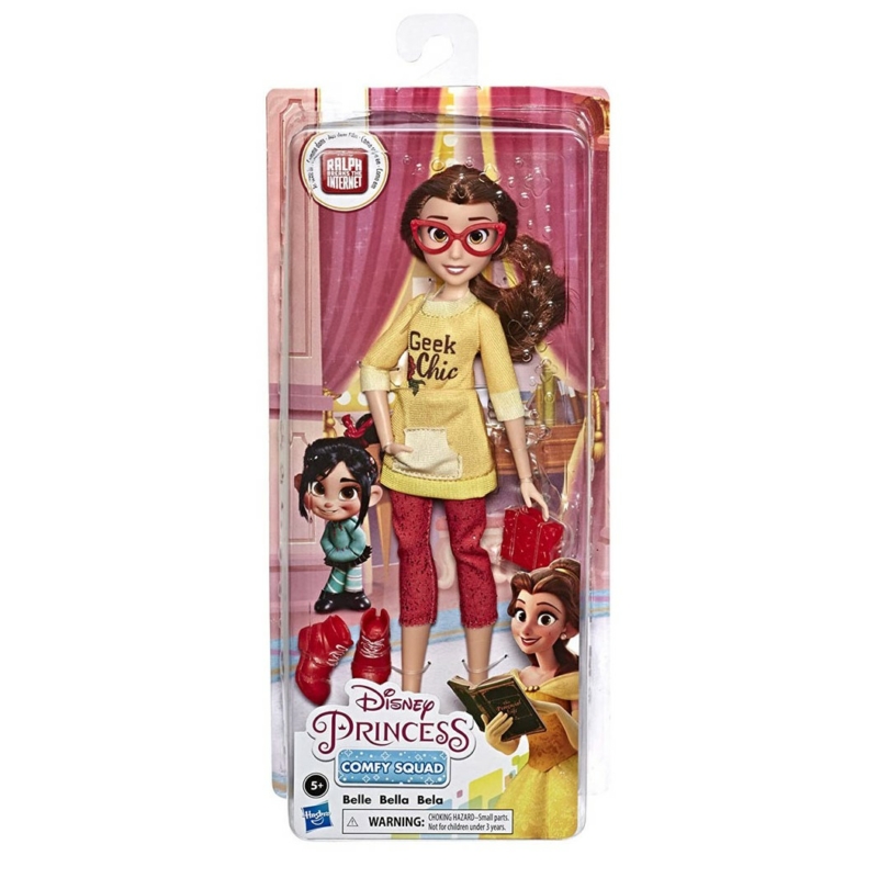 A Belle hercegnő baba kényelmes ruhában a klasszikus karakter modern oldalát mutatja be, kiegészítve cipővel, táskával és szemüveggel, amelyek a játékélményt és a szerepjáték lehetőségét gazdagítják.