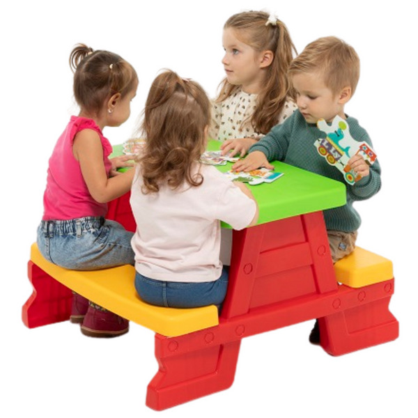 Ez a padokkal ellátott gyerek piknikasztal egy praktikus és funkcionális szett, amely tökéletes mind a kertbe, mind az otthonba. Tökéletes hely a játékra, a tanulásra és a közös időtöltésre a szabadban. Designjának és vonzó megjelenésének köszönhetően a szett arra ösztönzi a gyerekeket, hogy kreatív tevékenységekben vegyenek részt, mint például rajzolás, színezés és játék a társaikkal.