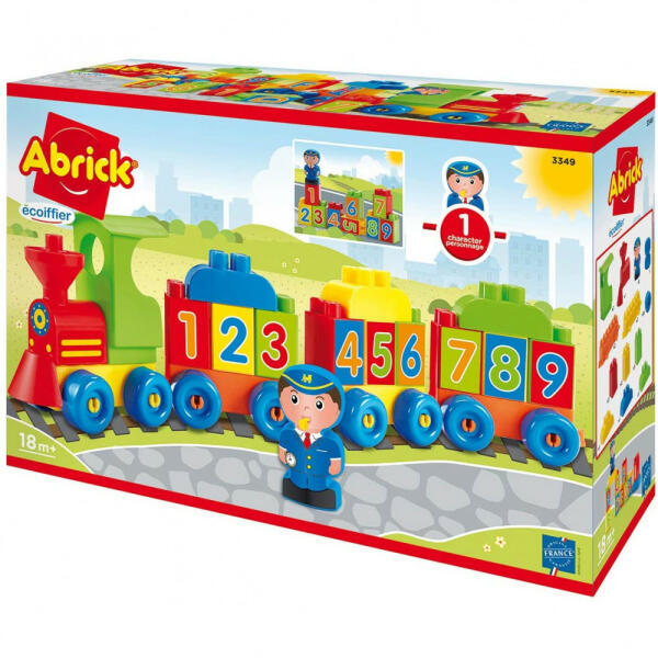 Az Écoiffier Abrick betű- és számvonat egy mozdonyt, 3 db kocsit, mozdonyvezető figurát, 9 db nyomtatott építőkockát (egyik oldalán számokkal 1-9-ig, másik oldalán betűkkel A-I-ig) és egyéb kiegészítőket tartalmaz.