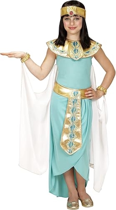 Teljes egyiptomi királynő jelmez lányoknak, amely egy tunikát, díszített övet, nyakláncot, karkötőket, látványos fejdíszt és rögzíthető köpenyt tartalmaz, így készen áll a farsangi bulikra, tematikus programokra vagy szerepjátékra. A viselet könnyű, kényelmes anyagból készült, egyszerűen fel- és levehető, és a részletes, színes kiegészítők élénk, ünnepi megjelenést biztosítanak. A szett nem tartalmaz parókát vagy cipőt, ezeket külön lehet beszerezni. Ez a jelmez klasszikus, királynői megjelenést ad gyermekednek, aki így bátran kiemelkedhet a jelmezes eseményeken.