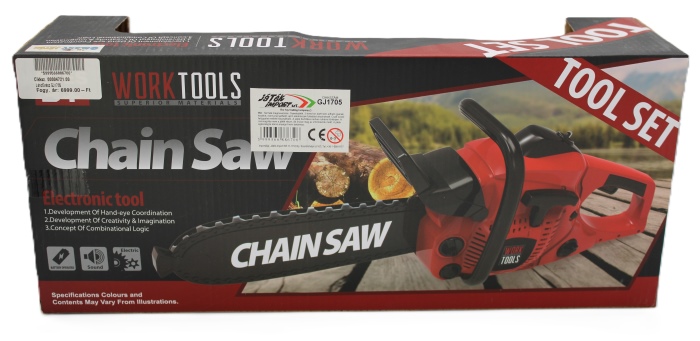 Ez a játék láncfűrész izgalmas, elemmel működő darab, amely gombnyomásra valósághű hanghatást ad, így a szerepjáték még élethűbb. A készülék 3 db AA-s elemmel működik (nem tartozék), könnyen kezelhető, gyerekek számára biztonságos, lekerekített műanyagból készült. Anyag: tartós műanyag. Korosztály: 3 éves kortól ajánlott. A láncfűrész hossza 39 cm, gyerek kézhez igazított, ideális első barkács- és szerepjátékokhoz, miközben fejleszti a finommotorikát és a kreativitást.