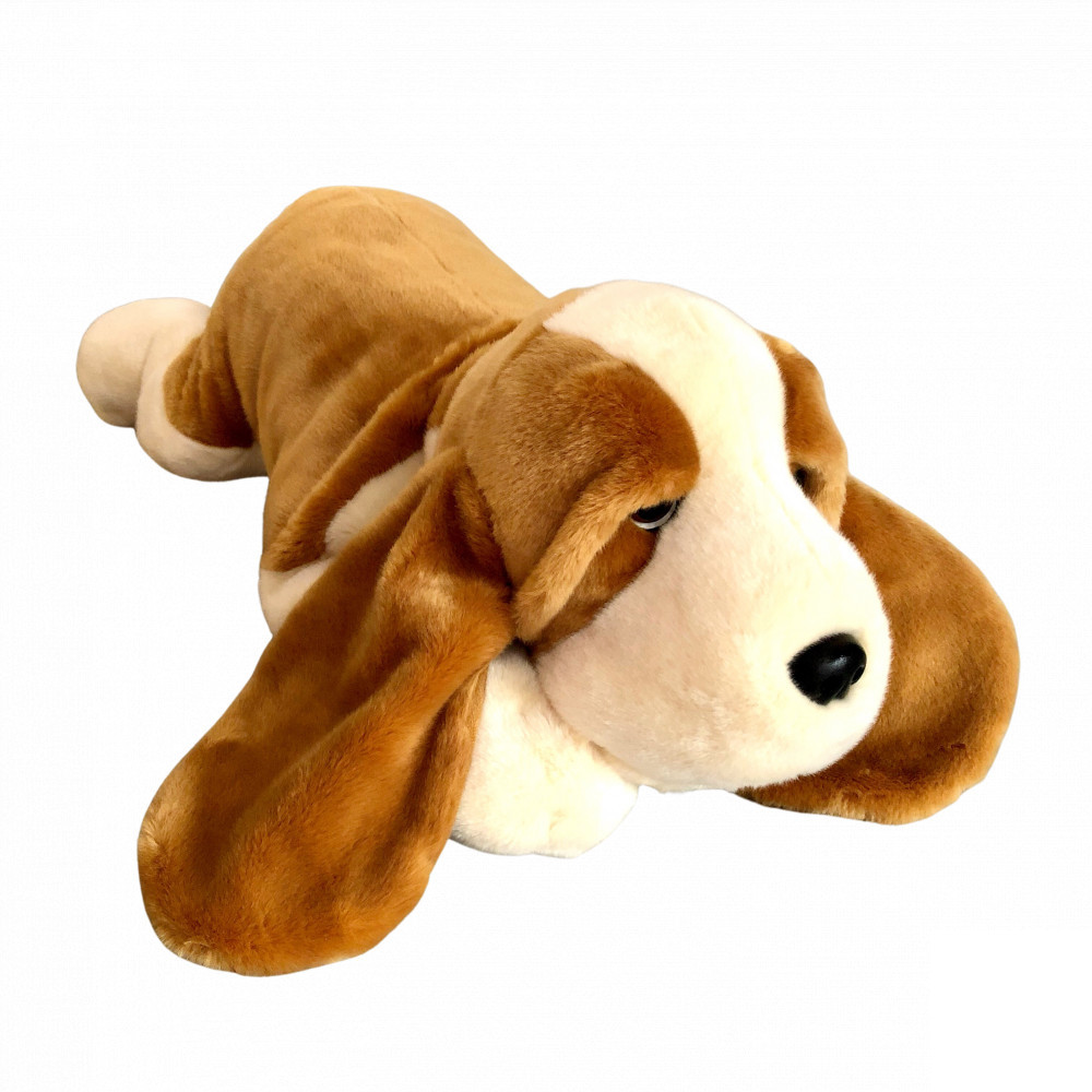 Élethű hosszú lógó fülü Basset kutya fekvő plüssfigura, melynek nagy szemei elvarázsolja a gyermekeket. A kutya kényelmesen el tud feküdni a szoba közepén, vagy akár párnaként is megállja a helyét!
