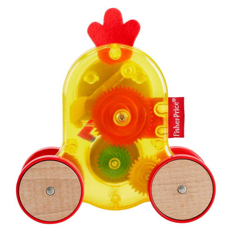 Kakas témájú, tolható játékautó fa díszítésű kerekekkel az ülő játékhoz és a mászáshoz. Ahogy a baba gurítja a kakast, a hasán lévő fémcsengő megszólal. A madár fején puha szövet tollak találhatók, amelyeket a baba felfedezhet. A jármű hátulja átlátszó, így a baba figyelheti a fogaskerekek forgását, miközben a jármű gurul.