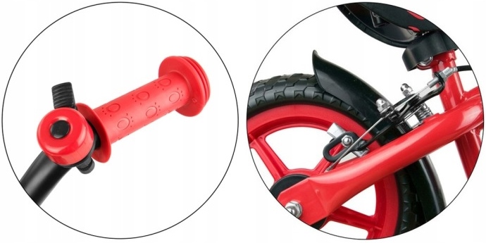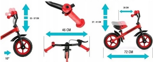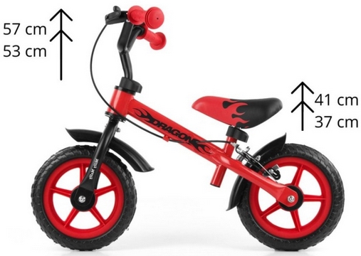 A Gyerek futóbicikli Milly Mally Dragon fékkel piros 10-es futóbicikli egyszerű, könnyű és stabil kialakítású egyensúlykerékpár, amely ideális első lépés a biciklizés megtanulásához. Pedálok nélkül készült, hogy a gyermek az egyensúlyra és az irányításra koncentrálhasson, miközben fejlődik a koordinációja és önbizalma. A futóbicikli acél vázzal, állítható magasságú ülés és kormánnyal rendelkezik, így könnyen igazítható a gyerek méretéhez. 10 colos piankerekekkel szerelt, amelyek sima gurulást biztosítanak, és a csúszásgátló markolatok kényelmes, biztonságos fogást nyújtanak. A modell tartalmaz kéziféket és dzwonek (csengő) kiegészítőt is. Méretei: a kerekek közötti távolság kb. 72 cm, a kormány magassága 53-57 cm, az ülés magassága 37-41 cm, a kormány szélessége kb. 46 cm, maximális terhelhetőség kb. 20 kg, saját tömeg kb. 2,8-3 kg.