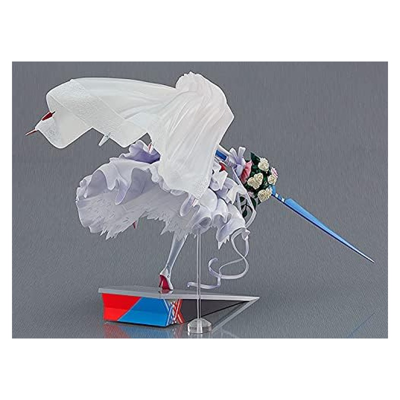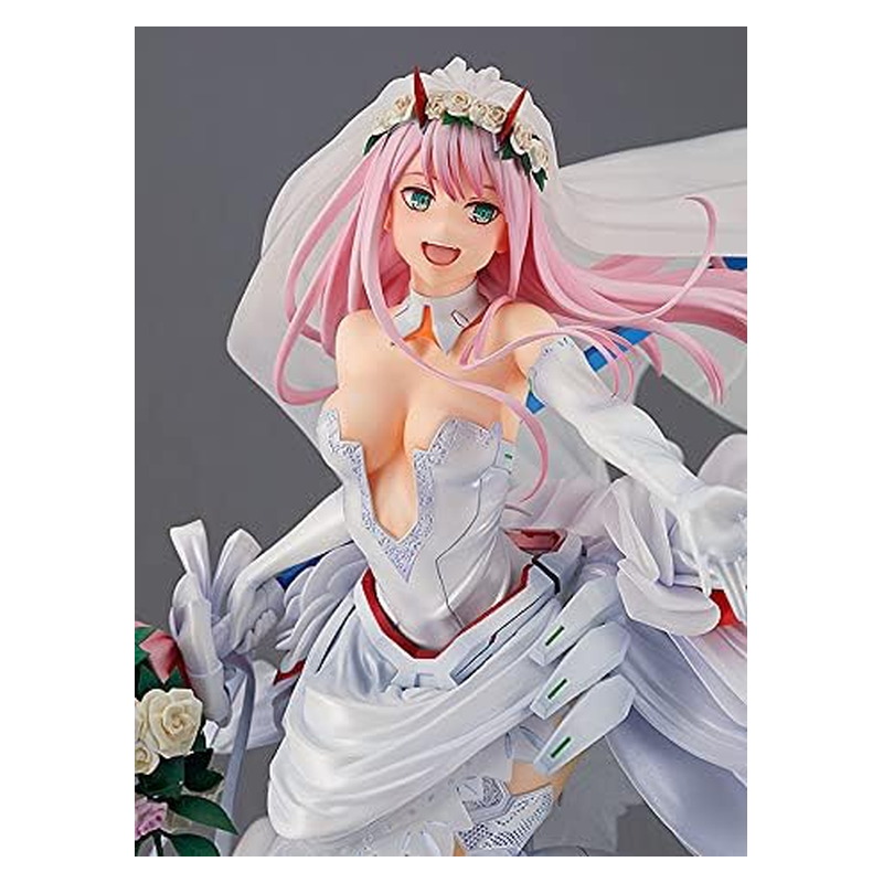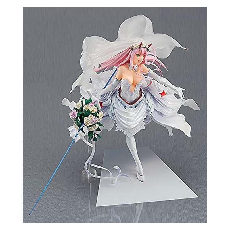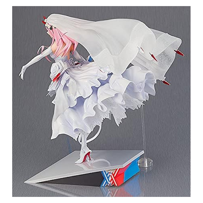Zero Two egy igazán különleges, gyűjtői kiadásban érkezik: a For My Darling verzióban esküvői ruhát visel, látványos, vitrinbe való pózban. A figura 1:7 méretarányú, kb. 27 cm magas, részletgazdag szobrászati kidolgozással és igényes festéssel. Stabil talppal jön, így kiállítva nagyon erős darab bármely Darling in the Franxx gyűjteményben.