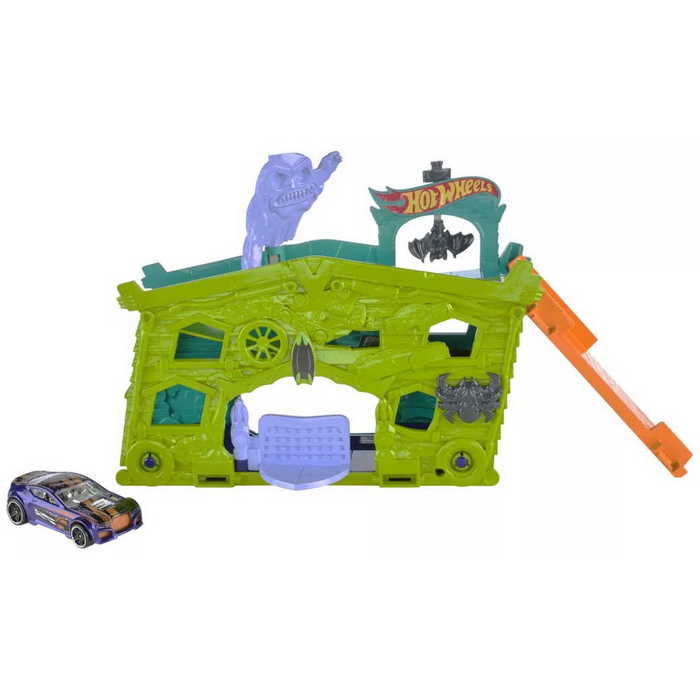 Üdvözlünk a Szellem garázsban, ami garantáltan nem átlagos hely arra, hogy Hot Wheels kisautódat leparkold. A garázs ijesztő megjelenése számos izgalmat rejt. A szett tetején egy csapóajtó található, ahová a kisautó leparkolható. A garázs oldalán egy pók helyezkedik el, amit megtekerve a csapóajtó lenyílik és a kisautó oldalt kigurul, miközben a tetőről egy ijesztő szellem bújik elő. A készlet tartalmaz egy Hot Wheels 1/64-es méretarányú kisautót is, hogy a pálya kibontása után azonnal kezdődhessen is a játék. A szett kompatibilis a többi Hot Wheels kisautóval és pályával.