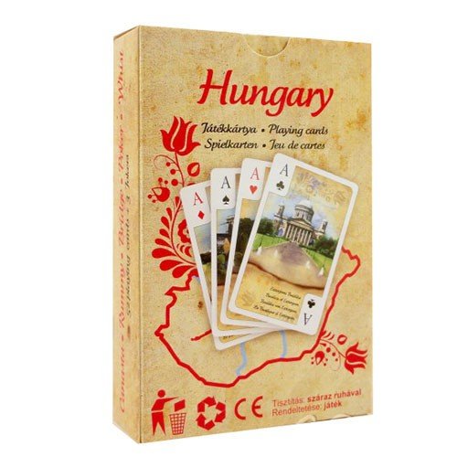 Magyarország szimpla bridge kártya, koronás lapokon akvarell képek Magyarország nevezetességeiről. 55 lapos pakli, standard minőségben.