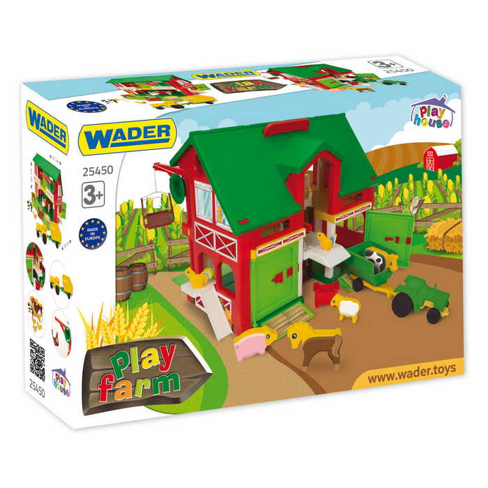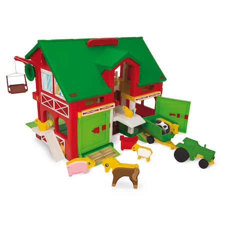 2 szintes farmház állatokkal és kiegészítőkkel. Díszitsd fel a készlethez tartozó matricákkal. Könnyen mozgatható a tetőből kihajtható fogantyúval.