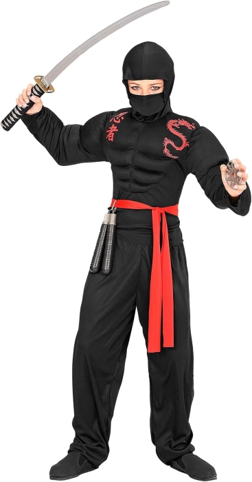 Gyerek ninja jelmez, puha poliészter anyagból, izgalmas harcos stílusú viselet farsangra, halloweenre vagy tematikus bulikra. A szett felsőrészt, nadrágot és jellegzetes részleteket tartalmaz, amelyekkel a gyermek gyorsan átváltozhat egy klasszikus ninja karakterré.