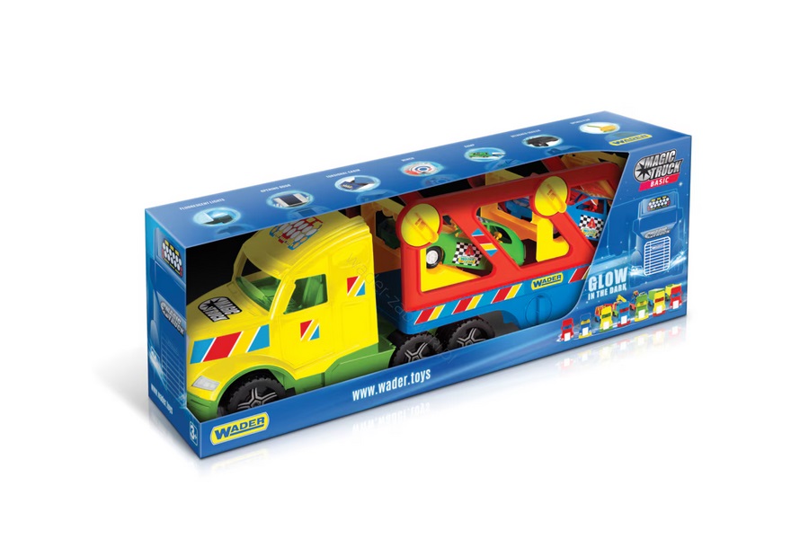 A Wader Magic Truck autószállító egy nagyméretű, színes játék teherautó, amely egy valódi jármű megjelenését utánozza. A vezetőfülkéhez kétféleképpen csatlakoztatható félpótkocsi révén a jármű hossza akár 110 cm is lehet. A készlet levehető félpótkocsit, rámpákat és oldallapokat, valamint két sportkocsit tartalmaz, így a rakodás és szállítás is része a játéknak. Az elülső részen elhelyezett fénycsövek világítás hatására a sötétben világítanak.