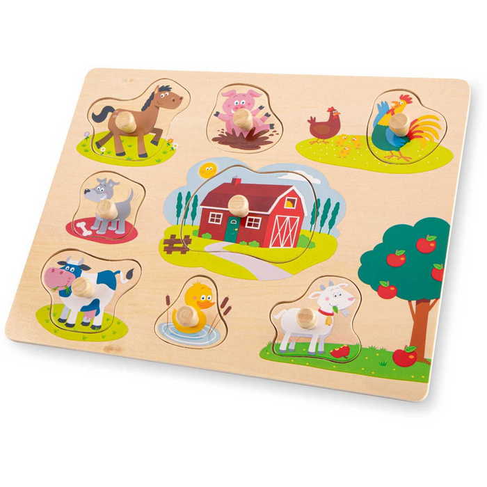 Indulj kalandra a farmra, és ismerkedj meg az ott élő állatokkal ezzel a Woet fa gombos kirakóval. A kirakó nyolc színes darabot tartalmaz, köztük egy tehenet, egy csirkét, egy kacsát, egy kutyát, egy malacot, egy lovat, egy kecskét és természetesen egy farmot. Minden darabon egyértelmű kép látható, amely a puzzle darab alatt is látható, így a kirakós játék könnyebbé és szórakoztatóbbá válik.