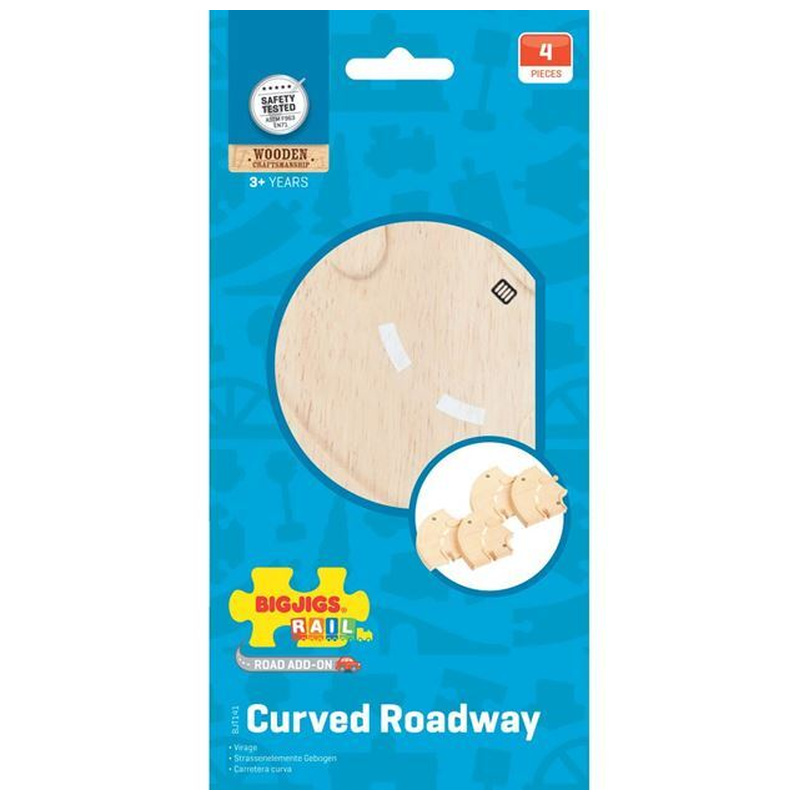 4 darab íves útelem, amivel változatosabbá tehető a fa úthálózat (város, parkoló, kereszteződések, kanyarok). Könnyen kombinálható más útelemekkel, így a járműves játék sokkal életszerűbb lesz. Tökéletes kiegészítő fa vasút mellé is, ha komplett terepet építetek.