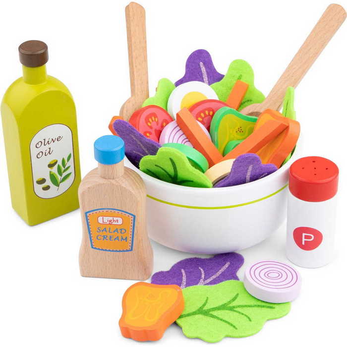 Ez a gyönyörű szett mindent tartalmaz, amire szükséged van, hogy finom salátát készíts a kis szakácsnak. Változtasd meg a különböző zöldségféléket, tojás szeleteket, olaj és salátaöntet palackokat, és készíts minden alkalommal más salátát. A salátalevelek filcből készültek. Ezzel a salátakészlettel játszani egyszerre szórakoztató és tanulságos, és elősegíti a gyerekek kreativitását. Ez a New Classic Toys salátakészlet a Bon Appetit termékcsalád része. Vágás, sütés, főzés és tálalás! A fazekak, serpenyők, vágókészletek és konyhák elengedhetetlen kellékek a kis konyhamesterek számára.