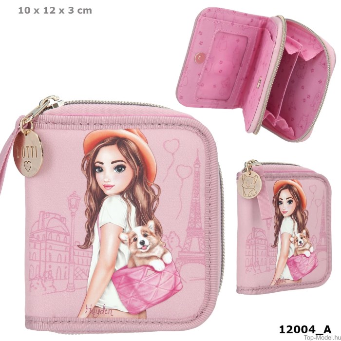 A Top Model Corgis pénztárca rózsaszín színvilágával és párizsi hangulatú mintájával igazán stílusos kiegészítő. Kompakt mérete praktikus aprópénz, bankjegyek és kártyák tárolására, miközben játékos és divatos megjelenést biztosít minden Corgis rajongónak.