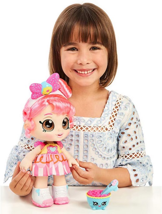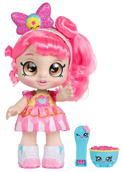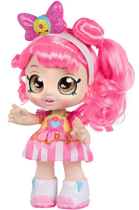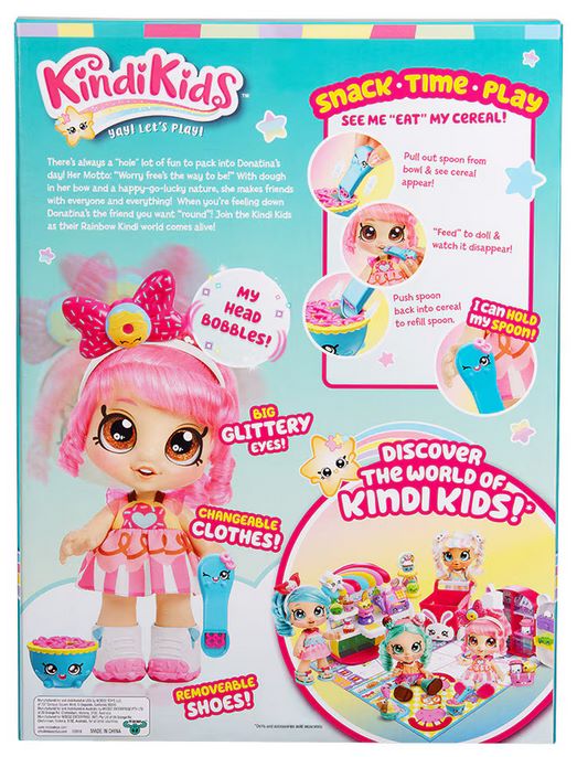 Ez egy KindiKids Donatina interaktív játékbaba, kb. 25-30 cm magas figura a KindiKids kollekcióból, amelyet óvodás korú gyerekek számára terveztek. A babának nagy csillogó szemei vannak és a feje mozgatható, valamint levehető ruhája és cipője is van. A csomag két kiegészítőt - többek között egy tálkukaccal és kanállal - tartalmaz, amelyek segítségével a babát "meg lehet etetni", és a gabonapelyhek játék közben eltűnnek a kanálról, amikor a gyerek a szája felé emeli azt. A figura 3 éves kortól ajánlott és kreatív, szerepjátékos játékhoz alkalmas.