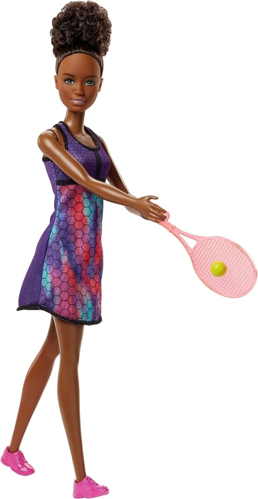Barbie baba sportos környezethez, aki teniszruhát és sportcipőt visel. A csomag tartalmaz teniszütőt és labdát is, amellyel a játék során a teniszjelenetek eljátszhatók. A baba mozgatható végtagokkal rendelkezik és önmagában nem áll meg. Más játékok vagy babák nem tartoznak hozzá. A játék 3 éves kortól ajánlott.