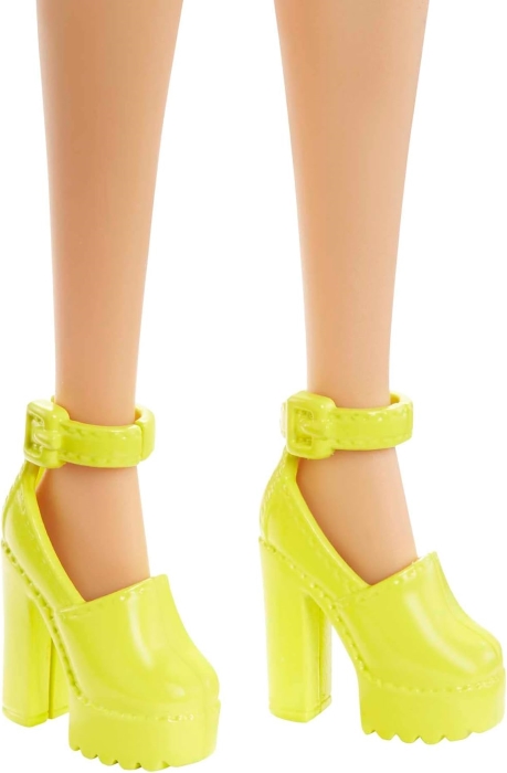 Ez egy Barbie Fashionistas kollekcióba tartozó játékbaba szivárványos ruhában, szőke hajjal és fogszabályzóval. A csomag tartalmaz platform cipőt és napszemüveget is, amely divatos megjelenést ad a játéknak. A baba mozgatható végtagokkal rendelkezik, a szerepjátékot és kreatív divat-mesélést ösztönzi, és 3 éves kortól ajánlott.