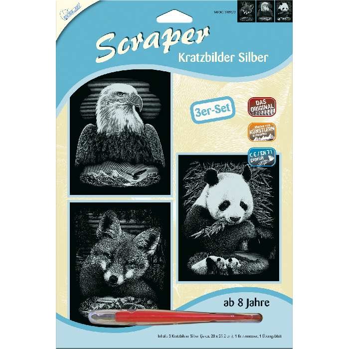3 ezüst képkarcoló (kb. 20 x 25,5 cm), 1 karcoló kés, 1 gyakorlólap